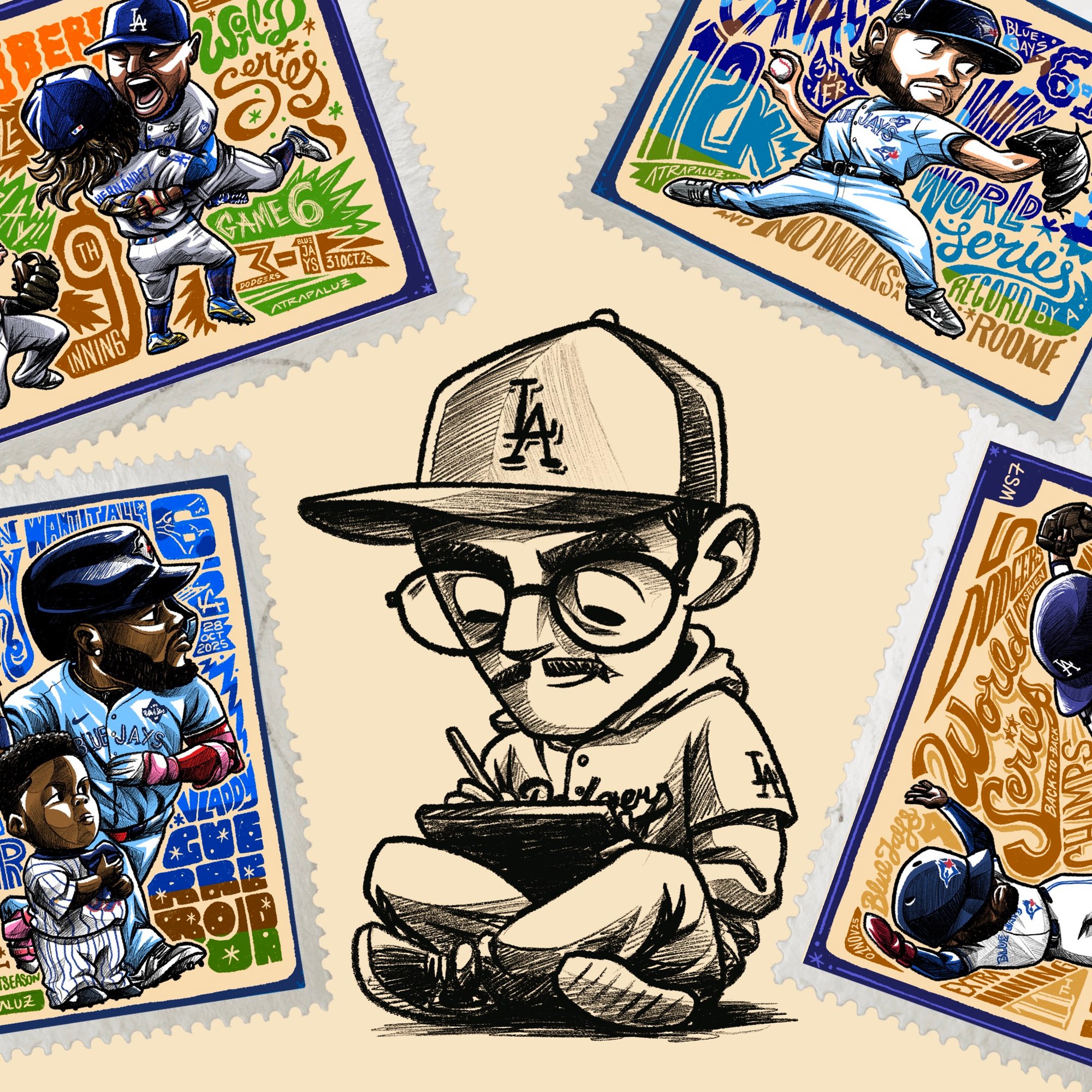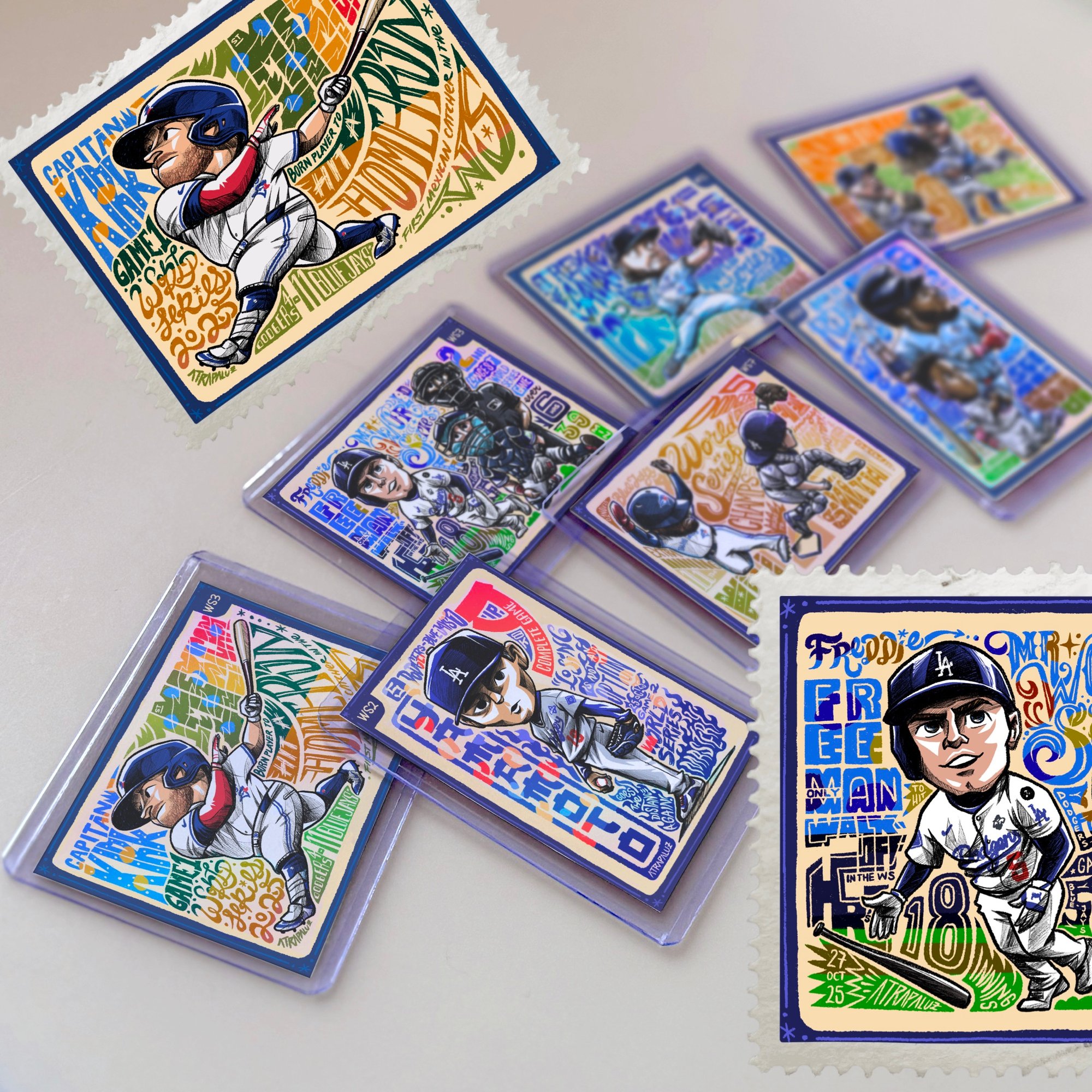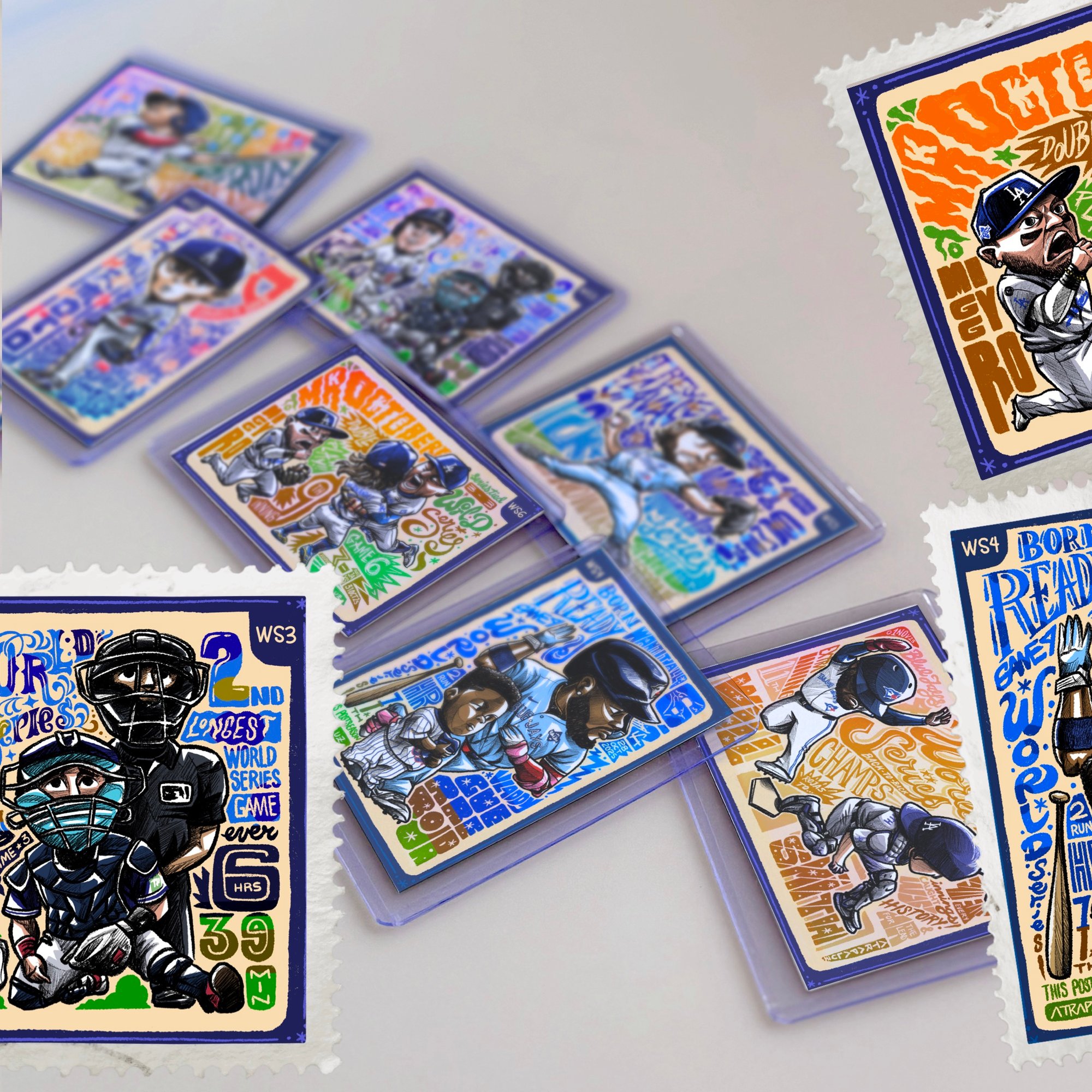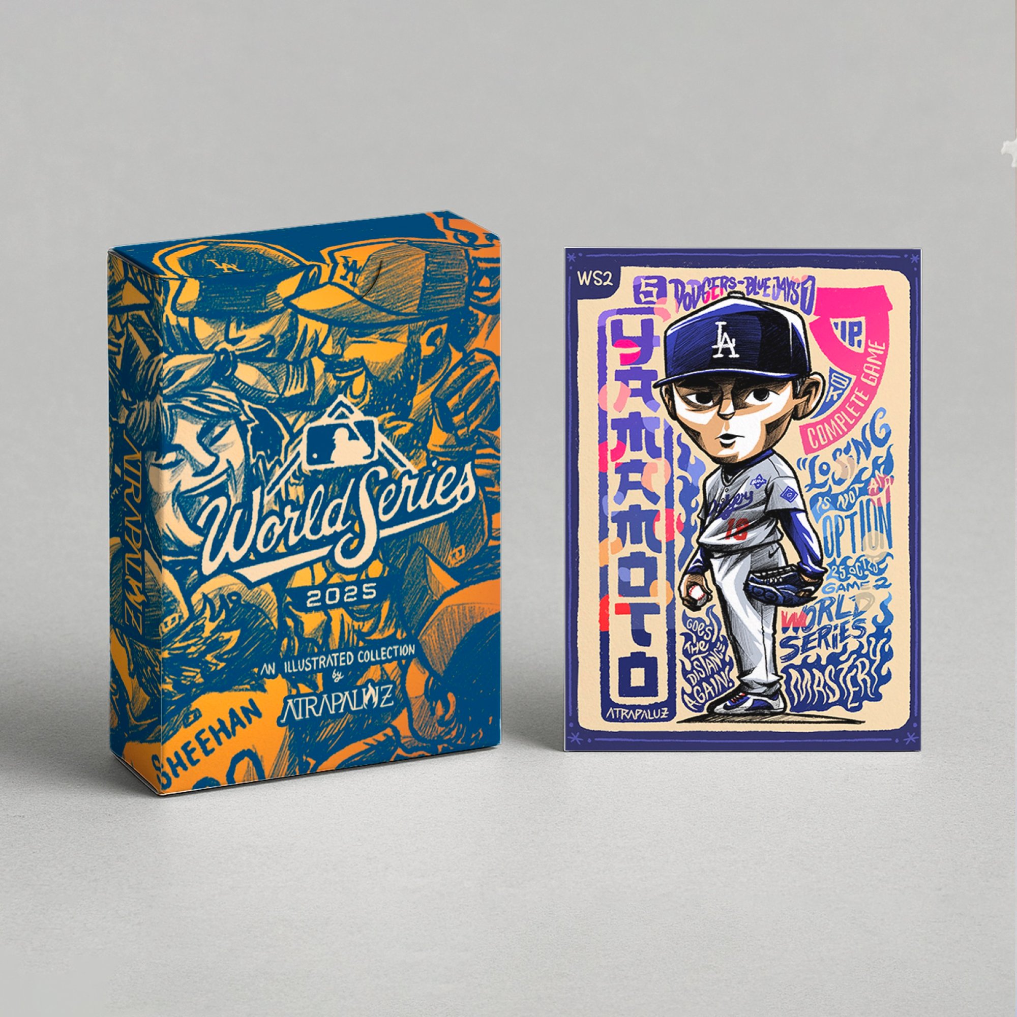 This one-of-a-kind collector’s pack brings together seve trading cards illustrated by Mexican artist Atrapaluz, each one portraying a key moment from every game of the historic 2025 World Series between the Los Angeles Dodgers and the Toronto Blue Jays.